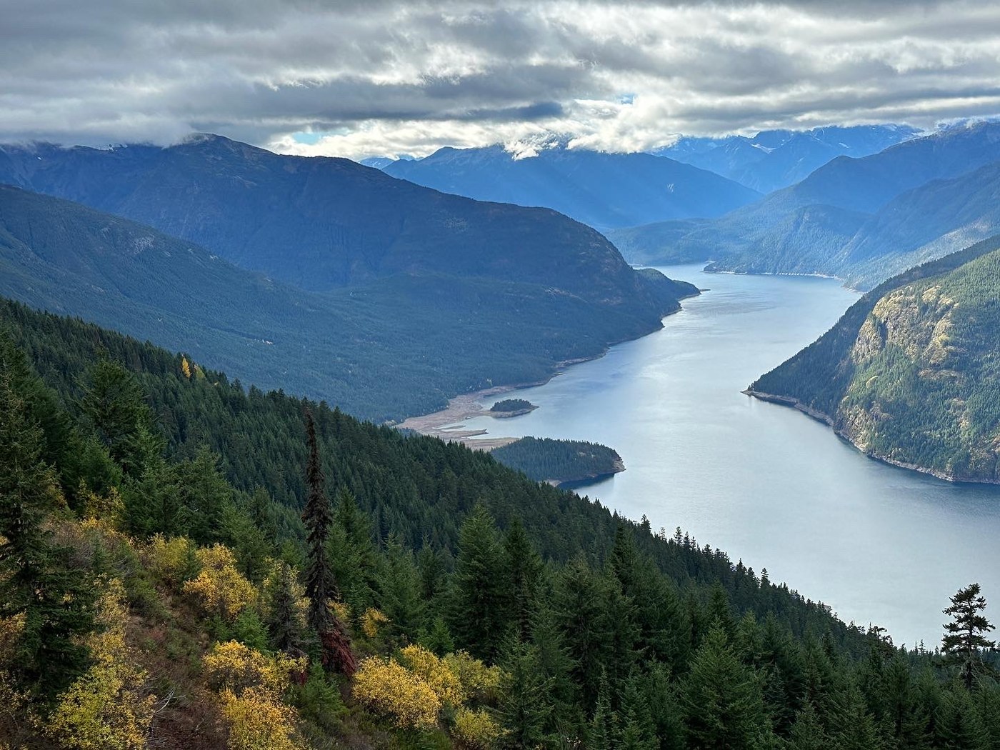 Hike to Deso Peak on Wed. We parked on hwy 20 and hiked 1 miles to the Ross Lake Resort dock. We spend the night at the Resort and had them take us by boat to the TH. We got dropped off at 8:30 and told them to pick us up at 5, worried that this hike would take us much longer. It was described as very strenuous in various sources. It is uphill, yes, but we were at the top at noon. Just up, up, no exposure or anything treacherous. The lookout was shut down and we saw 0 people. Very cold at the top. Had all layers on. Beautiful views. We had lots of time to spare at the bottom and hiked along the lake. The colors were brilliant. At 5pm the boat came to fetch us and take us back to Ross Resort.