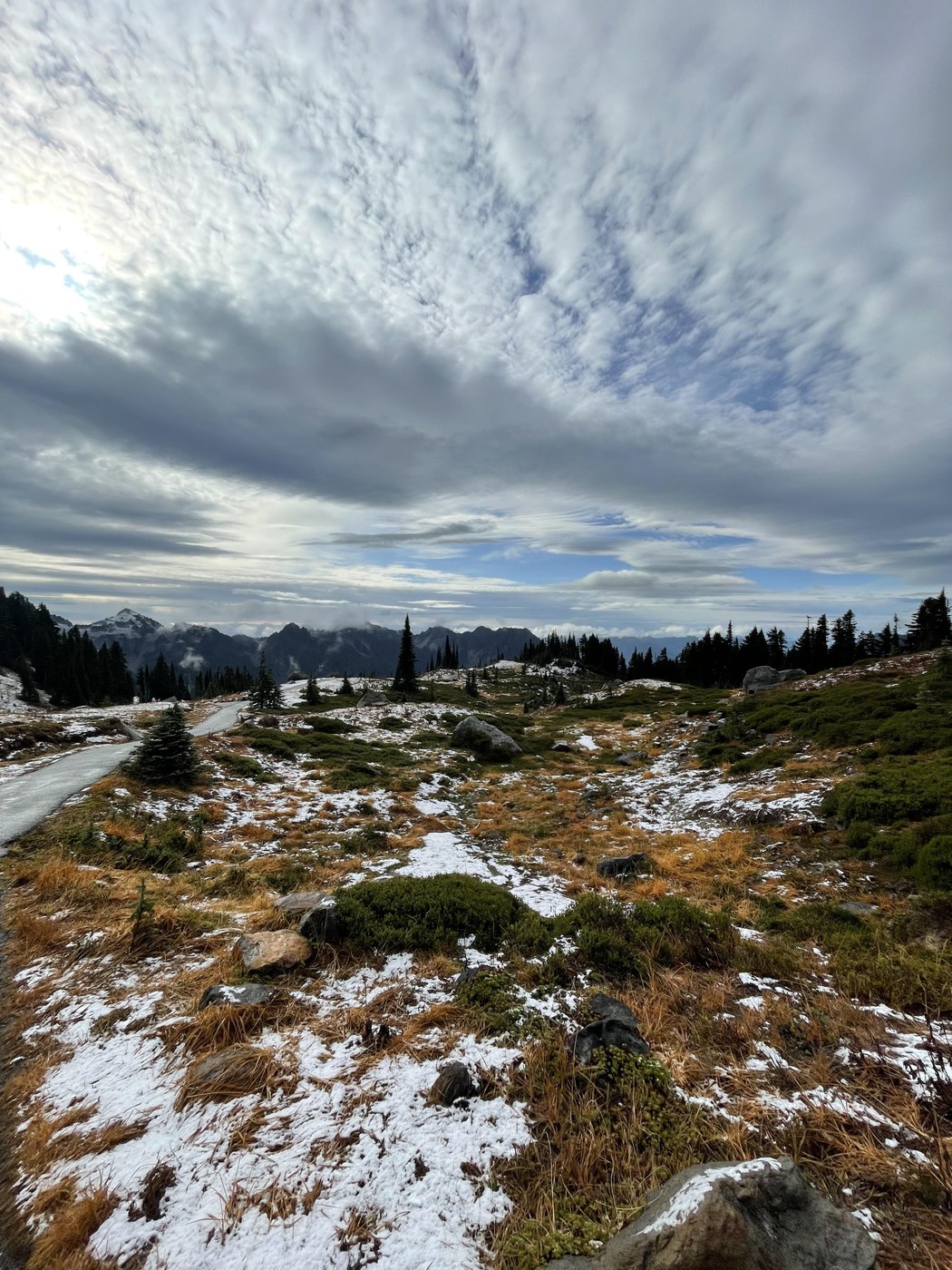 My plan was Comet Falls but the mountain was out, the road was clear, and there was no one at the Comet Falls trailhead. So I headed up to Paradise to a small handful of cars, probably most of them skiiers and snowboarders. There was no snow at the start and a few slick spots, but nothing nasty. I headed up Deadhorse Creek loving the quiet morning. Cool clouds, muted tones, and running water were the rock stars today. Once you clear the bulk of trees there was a dusting of snow and some thin ice over puddles. I continued onto Glacier Vista taking a picture every twenty feet. It's always a little different on the mountain, but I had never experienced so many soft colors and textures. If there isn't much snow, this is a great trail. I saw a lot of street clothes on the trail today with flat-soled tennies. That won't cut it pretty soon; layers, poles, spikes, gloves and hat, water and snacks, a map, and research into trail conditions...will allow you the most fun and safety on the mountain.