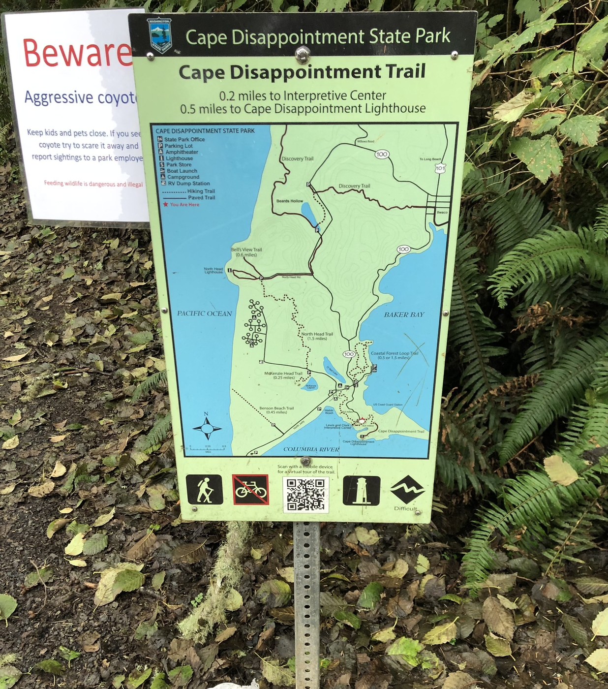 This is a very short stroll to see the Cape Disappointment Lighthouse. Parked in paved lot on a wet Sunday November afternoon with only about another dozen cars. No RR here so plan accordingly. A sign with the trail marks the entrance - along with a temporary sign about an aggressive coyote spotted in the area (several of these signs along the route, just be aware). The wooded trail is a little steep in places (and wet this time of year), but short. It takes you past the Coastguard station, then up a concrete incline up to the lighthouse. Super windy at the top so hold on to your hat! We had a wet day but still wide, sweeping views of the Columbia River Bar.