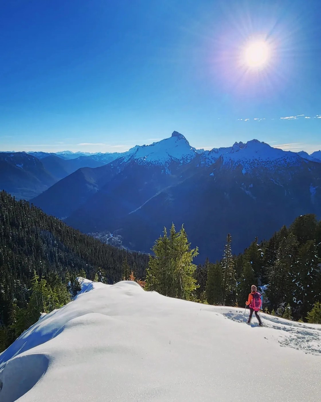 Once at the Gap, we headed right and eventually put on snowshoes as we climbed and the snow deepened. Peekaboo views began to tease us as we headed on, and we finally broke out into more open terrain with beautiful views especially of Mt. Pugh and Sloan dominating the skyline.