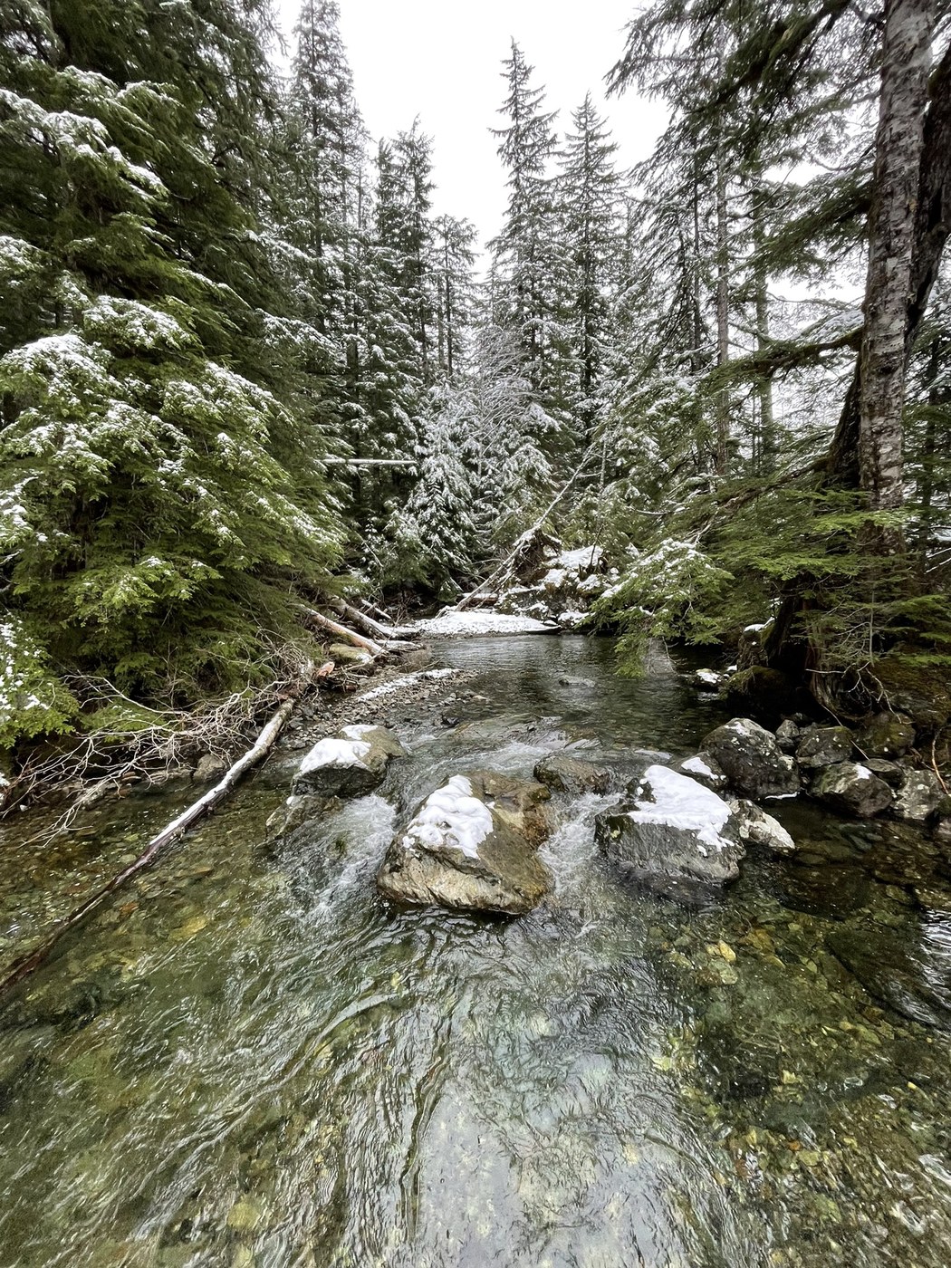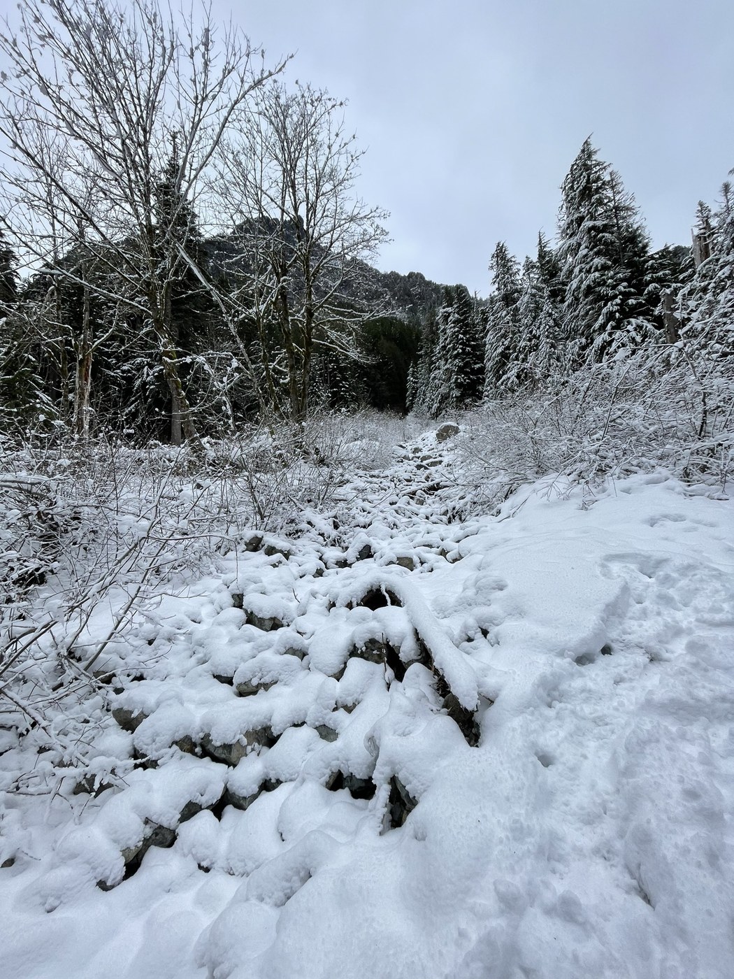 The lake has a lovely icy crust and the snow is gorgeous. Heard lots of cracking sounds from the mountain.