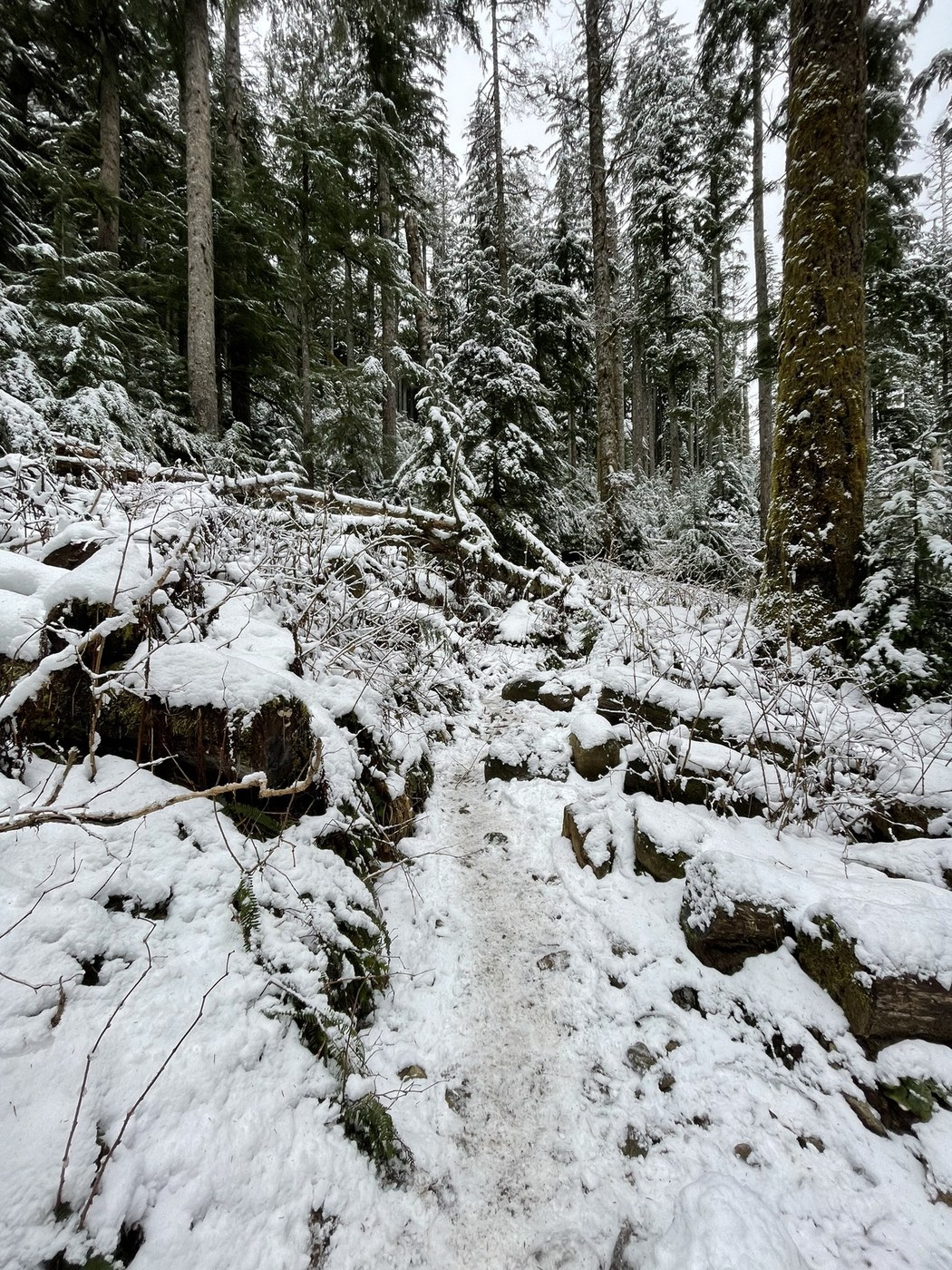 Trail was primarily packed snow. I had my spikes with me but never ended up using them, just balanced on my pole.
