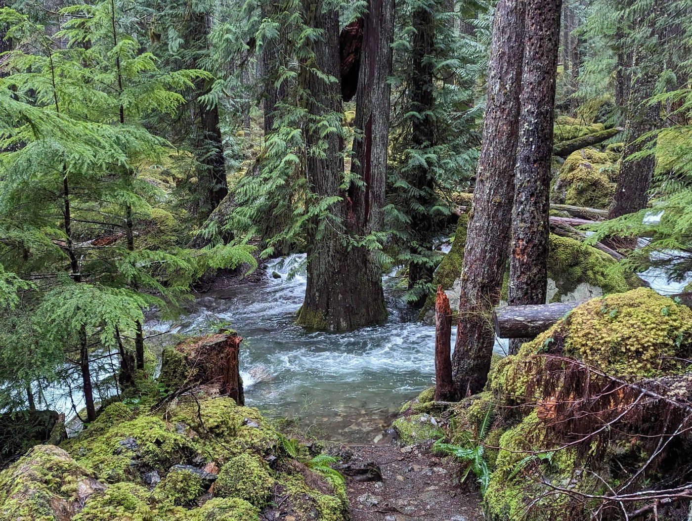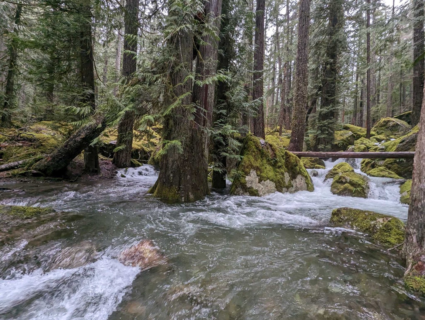 The Lena Creek crossing at 1.8 mi is currently impassable due to deep, fast moving water. If you really wanted to, you could possibly scoot across a high log but it seemed pretty risky. Best to wait until the rain lightens up and the creek level drops.