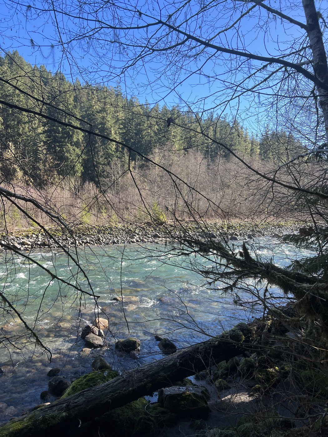 Beautiful winter day for a hike. TH is located right off of Mountain Loop Highway about 10 minutes outside of Darrington. No bathroom at North TH where we parked. Trail is mostly flat through the forest with lots of roots and rocks. Beautiful views of Sauk River and a few steep areas to access the river, but may want to bring water for dogs. Lots of amazing old growth trees, moss, and mushrooms. Great trail for all ages and skill levels. Trail is listed as 3 miles one way with 600 ft total elevation gain, we did the first two miles before turning back.