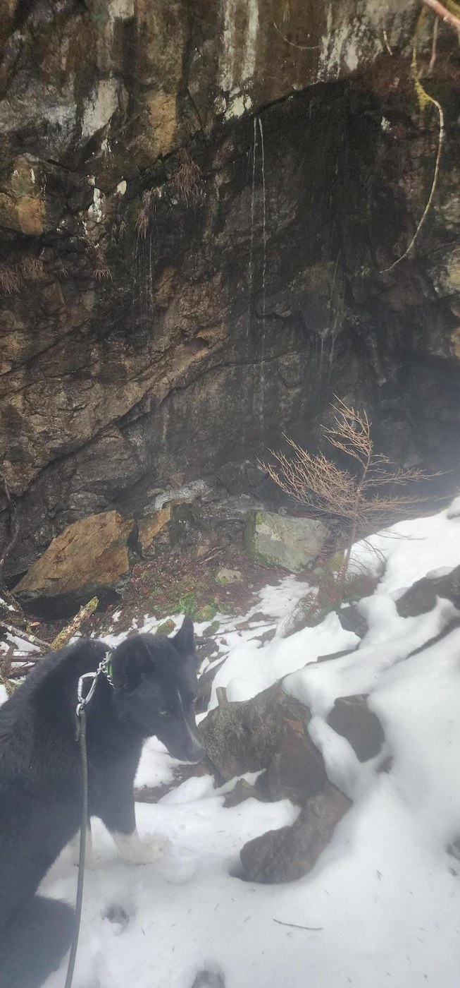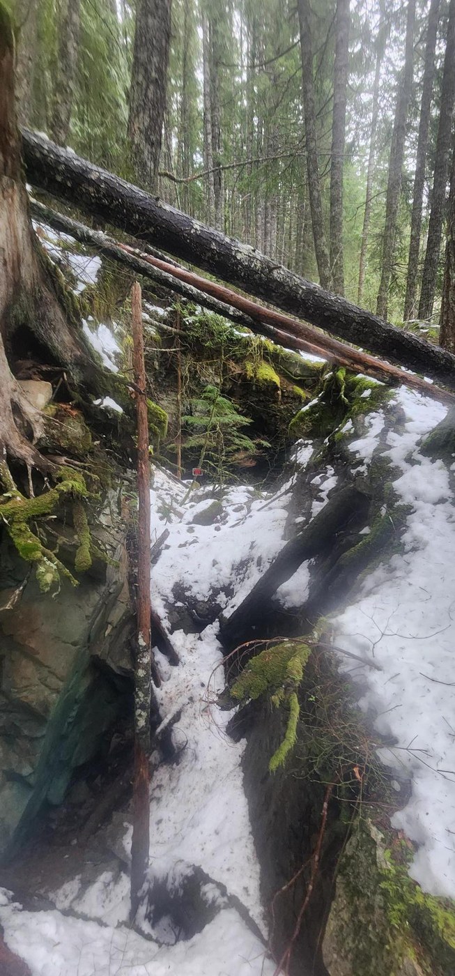 My last visit to the Sunset copper mine was back in 2018. Repairs to the Index Galena road were just beginning to take shape then and are now completed with the road higher up on the hillside and erosion control being placed between it and the river. The old road leading to the mill foundation site is now gated close to the road. Room for a few vehicles to not block access to the gate. We hiked up in a few inches of intermittent snow that was deeper and thicker as we ascended. Gaiters were nice to have. Giant moss covered boulders on the slope above are pretty amazing to see. We hiked along the road bed for a while till we came across fresh flagging tape indicating the trail to the mine shafts. I found it easier to follow in the snow than later in the season and the frequent tape kept us going in the correct direction.. that and a very accurate trail map on the GPSr. As we ascended in the forest canopy, I noticed a split in the trail I hadn't known about before, and some led to other adits along the way. All of which are appropriately labeled KEEP OUT. The last section of the trail is rather steep, but short and soon we were facing the Gaping Maw opening of the mine shaft. Its quite impressive to see. I didn't explore inside the shaft at all but you can feel a bit of a breeze flowing here. I figured the other trail I saw below likely led up around the area to the south so we meandered over and sure enough, an equally large opening presented itself. A couple more adits were spotted which my dog really wanted to explore. The rain and cold were starting to get to me at this point so we made our way down following the flagging til we intersected our original path up.