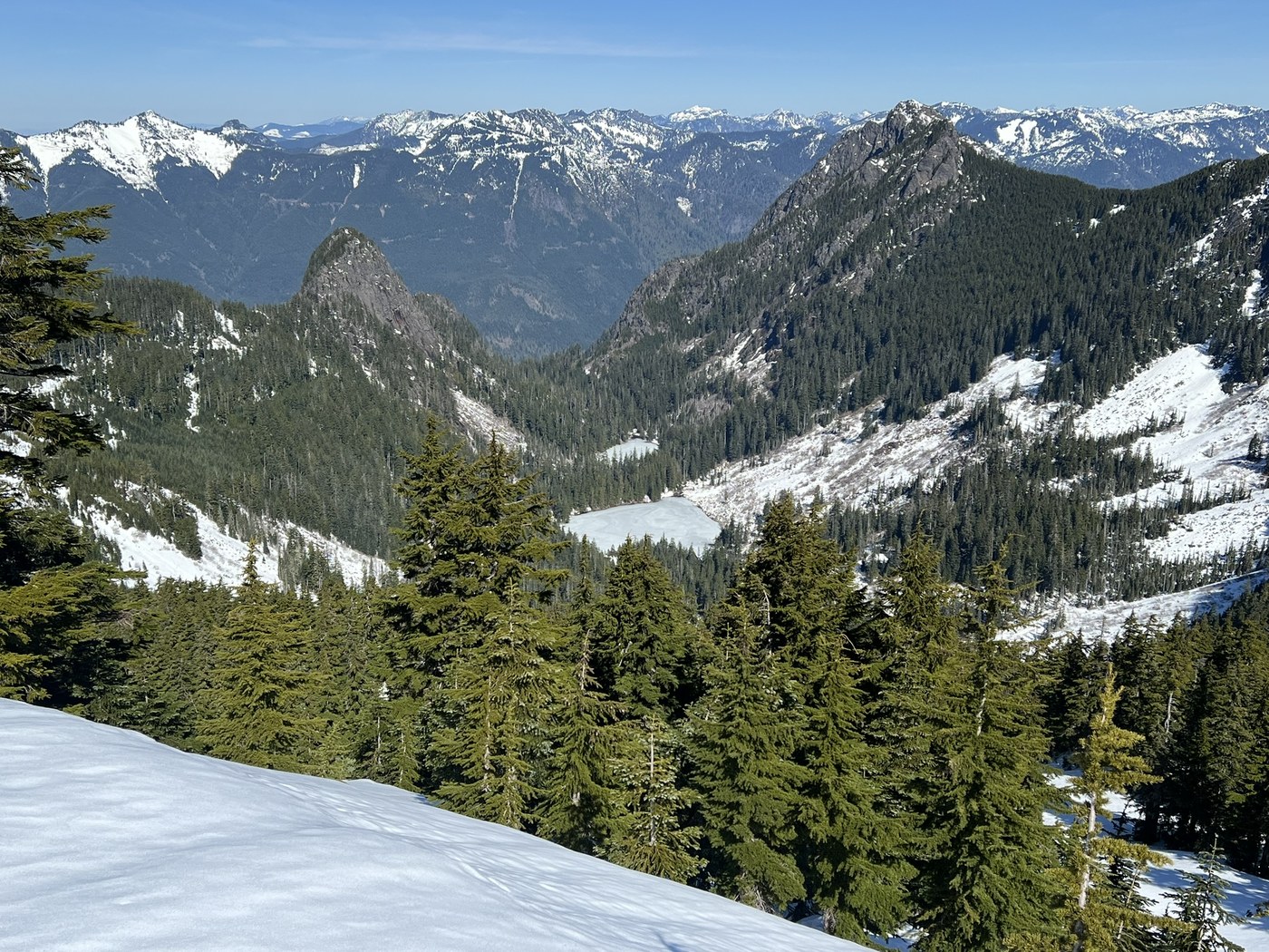 I went up towards Thompson Lake and there almost immediately snowshoes were useful. Somebody postholed all the way a few days ago, but the track looked exhausting. I'd bring snowshoes. I went to Thompson Point for some nice views. On the lower switchback I took the shortcut straight up (see Strava for the track). My bootpath will probably be visible for a couple of days.