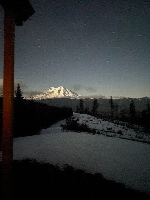 Snow has been melting fast on the trail. Some sections have no snow at all. I didn't used spikes nor snowshoes to get to the hut. I put on spikes when I left in the morning. The gazebo was pretty. The sunset was very colorful. It was pretty warm in the room. Even outside at night was not too cold.