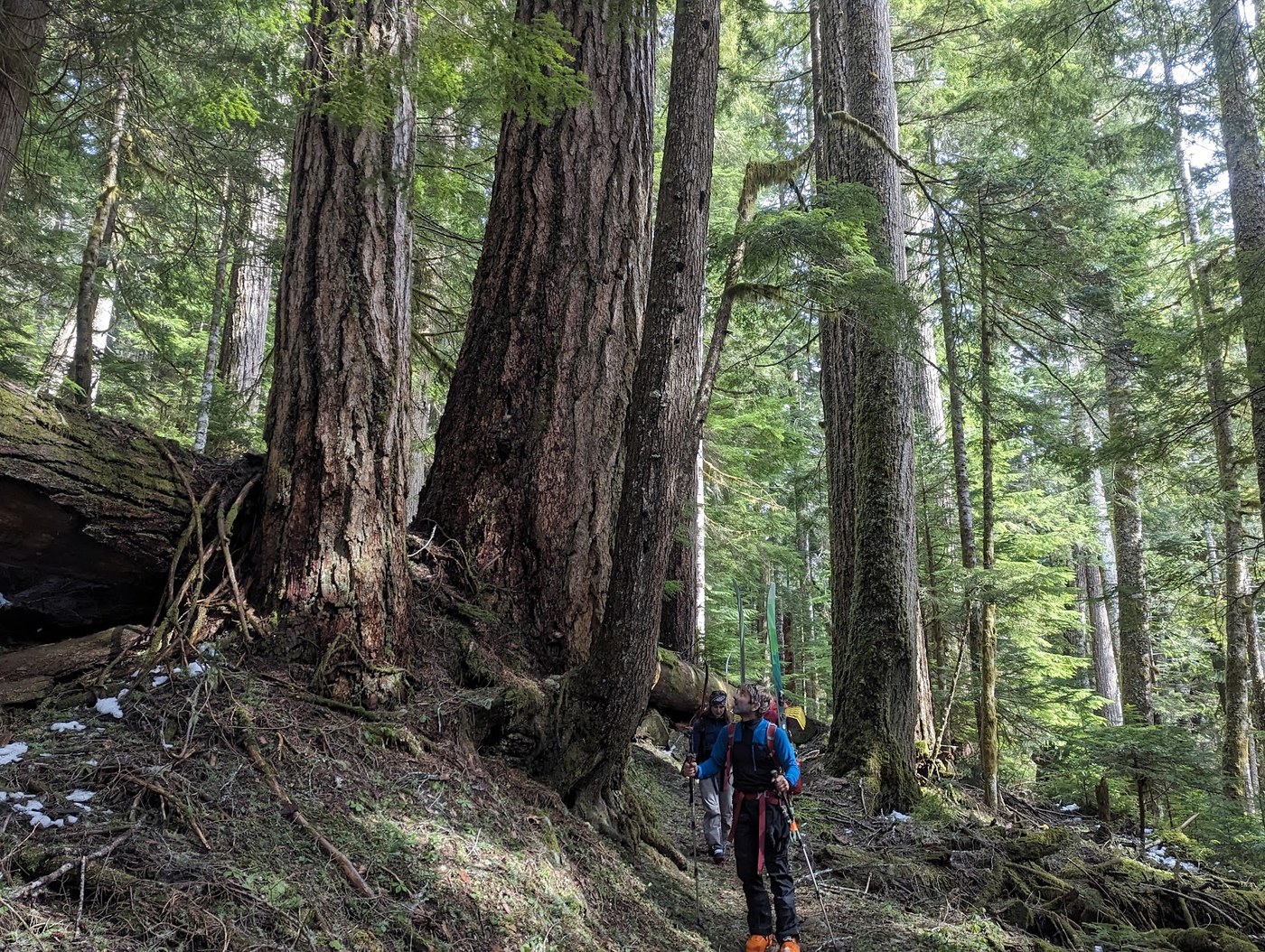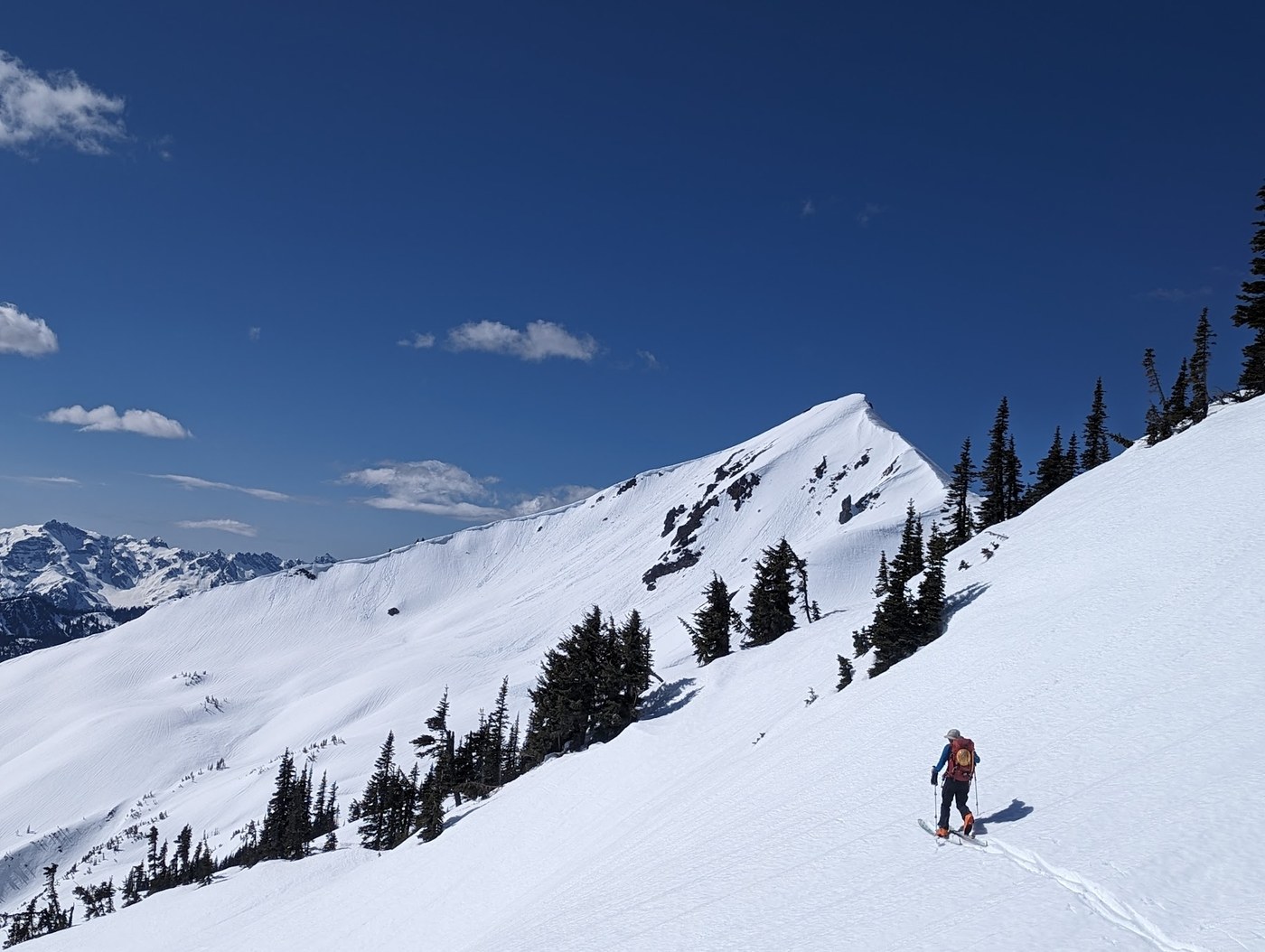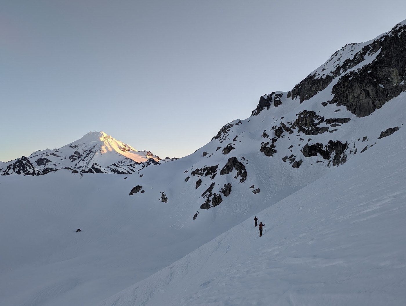 The summer trail that goes to Glacier Peak is not good for skiing unless you have enough fresh snow to sidehill. We did not and it was a very icy and steep 0400 start from White Pass to Glacier. I suggest skiing from Red Pass over the ridge to avoid the heinous traverse.