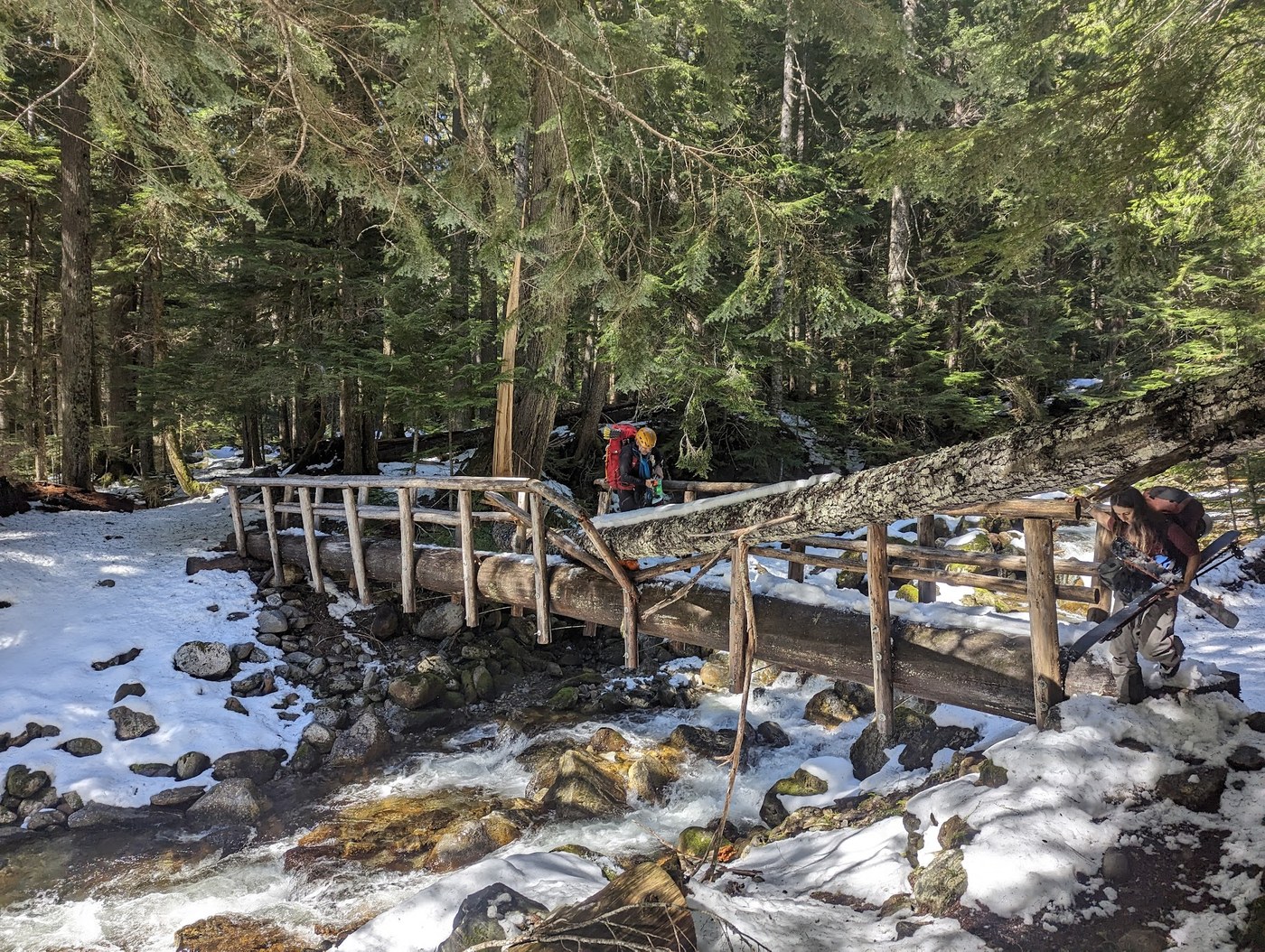 The trail itself is fine for hiking until the shelter if you've got waterproof boots and don't mind some snow (occasional patches of 2ft+, but mostly 4-8 inches). Many fallen trees, including on a bridge. We brought skis for Glacier Peak, and there were a bunch of booting and skiing transitions in the first 6 miles of forested path. Kind of a pain.