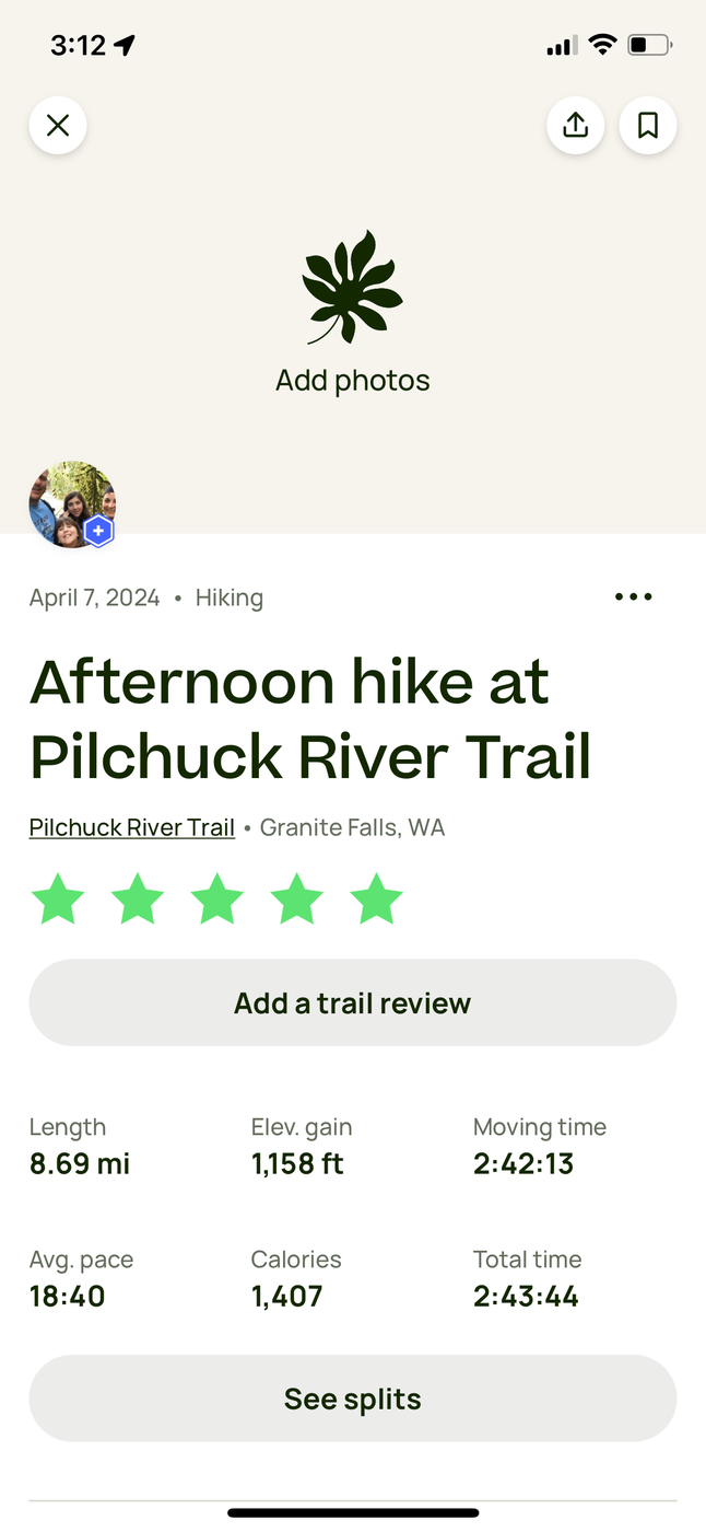 The dog and I headed out for the Pilchuck River trail since we haven’t done it in over a year. This one is also labeled as P-5000 Rd on the WTA site. Very flat out and back that gets you 7ish miles and 700’ of gain. We decided to go off the main trail and make this a loop hike using old logging roads and trails to get back to the parking lot. Saw only two groups on the main trail and no one on our loop. Plenty of parking around noon on a Sunday. Posting our loop in the photos should anyone like to make this hike a little longer with more elevation gain.