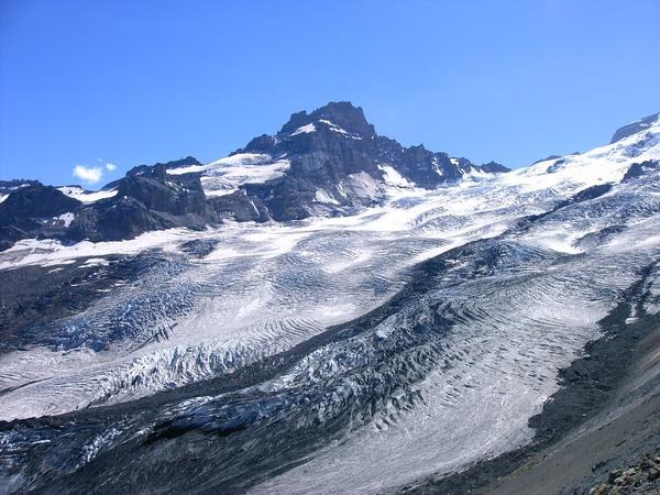 Be prepared coming down Ruth to step around a nice little exposure if you intend to carry on. With a heavy pack, it takes some grace and care. Once past, the trail briefly levels off and soon picks back up with the climb up Steamboat. It's relentless and on a nice summer day, is hot, hot, hot--no water, no shade, lots of exposed ridge. Usually a nice breeze keeps things cool enough. After the dance up boulders and more loose rock, the trail then skirts around to the left of the Prow to emerge on top of a gully with extremely loose rock. At this point, Camp Schurman comes into view and is just a few more steps away.....or, uh, slips. This little slope is VERY challenging with a loaded pack, or without for that matter. Footing is really bad. It's like walking on marbles with few solid hand-holds. If you slip, you go for a bouncy ride down the rock face to hit the Winthrop Glacier below. Not fun. Lots of caution is needed here, to say the least. Once down the trickiest part, you hit a well-beaten path over to camp.