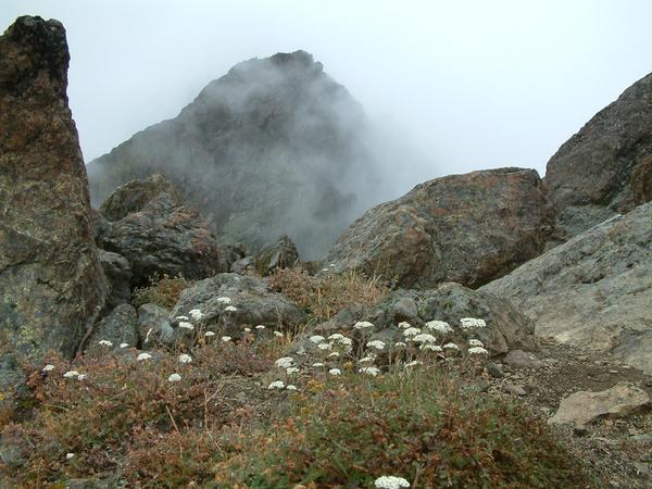 Thwarted from a hike up Mt. Jupiter by the continued closure of the access road due to logging, headed up Buckhorn Mountain via the Upper Big Quilcene trail to show a friend the view. The advertised partly cloudy conditions never materialized, so the views were quite limited. Left the TH at 2500 ft at 8AM and reached the 6988 ft summit at 11AM. On the way, a break in the clouds at Marmot Pass (6000 ft) briefly revealed the Needles and Mt. Deception with new snow above about 6500 ft. As for trail conditions, someone has spent a lot of energy shaping up the trail a half mile or so east of Camp Mystery where fallen rock last winter had made crossing the rock slides a minor challenge. The trail across this section is in fine shape now. No snow yet on Buckhorn from Marmot Pass to the summit. Clouds socked in the summit the 40 minutes we were there, with a couple of brief breaks.