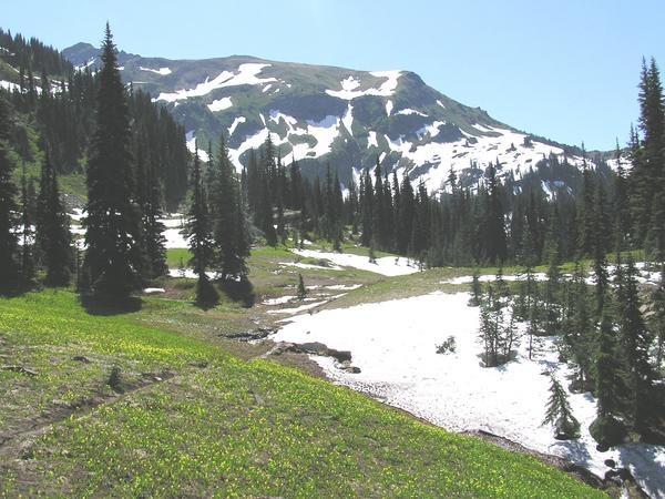 You leave the forest just before the pass. Once at the Frosty Pass juncture everything opens up. The meadows were crowded with avalanche lily in bloom. Blankets of yellow. The trail would still disappear under snow, but once out of the trees it’s so much easier to see where it goes.