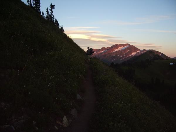 The sun was setting on us by the time we reached our packs. This was great though. The views of Indian Head Peak above White Pass were excellent. Purple Mountains all around us. We set the tent up in the camping area at White Pass and by the time we were eating our dinner it was pitch dark.
