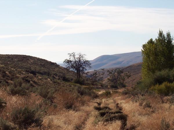 The weather was beautiful, but quite a bit of wind which was cooling and helping us along the way. We stayed on the main trail until we headed down the last ridge and then we cut across and headed down towards Birdsong Tree area which is along Roza Creek. The Birdsong Tree area is also a site of an old farmhouse and has a couple of old apple trees near, with a few apples on it. We did not have anyone else joining us for the camp spot and that was really nice, just to hang out with ""family"" for the weekend. There was still water in Roza Creek and in the spring.