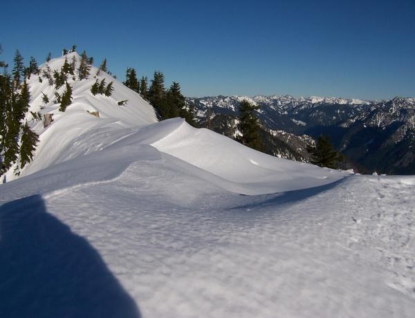 Getting from the crown of the SE ridge up onto the summit ridge takes a little high stepping. Snowshoes and poles worked for me. Some might prefer kicking steps and having an ice ax for this short segment.
