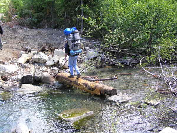 As we started started our weekend backpacking, Saturday, to Thorp Lake we found the bridge washed out close to the start of the Thorp Creek trail. Craig (our handy Paul Bunyan) waded out in the river and build a bridge (see picture). The Thorp Creek trail is in pretty good shape, but there are a couple of trees across trail at some locations.