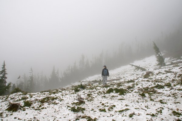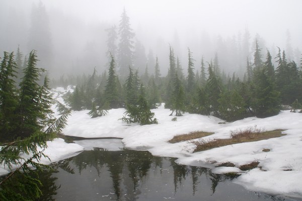 The trail up from the trailhead to the saddle was clear and easy, and we even got a glimpse of the sun on an otherwise-cloudy and foggy day. However, once we crossed the saddle and began our descent to Snow Lake, we encountered snow patches on the trail. The trail was easy to find because it's so heavily-tread, but beware of punching through the snow near rocks, trees, and streams. Everything was melting, and as the trail flattened out near the lake shore, meltwater pools and mud bogs surrounded us. Also, the entire basin was fogged in, and we couldn't see anything of Snow Lake except the icy water at the shore. After encountering larger snow patches on the way to the Rock Creek outlet, we turned around and had lunch on the rocks by the lake. We decided it would be futile to try and wait for it to all burn off and started heading back. Before the saddle, we took the 1013.2 spur trail to Source Lake Overlook. This side trail was barely used: There were no boot tracks to follow, and it was so over-grown that we lost the trail several times. We eventually ran into a wide snowfield where we lost the trail completely, and with the sound of a stream somewhere beneath the snow, decided to back-track to the saddle. We were surprised there was so much snow left, in August! On the bright side: The fog meant no sunburn and no mosquitoes. A decent day for our first real hike of the summer.