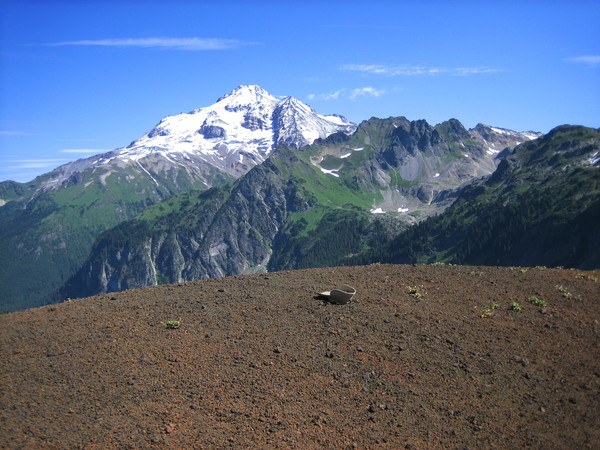 Though there are camps almost two miles further down the pass, we took the loads off our feet as quickly as possible on one of the rocky perches just below, surrounded by melting snow and crystal waters. From here, we hiked the next day to the top of Cinder Cone where we spent quite the fine time with views of ice-covered ponds and snow-covered mountains and glaciers. We must have been seen by the pilots of the low-flying KC-130. This cindery cone-top vantage is perfect for scoping out the trip up to the White Chuck Glacier which, alas, will have to wait another visit.