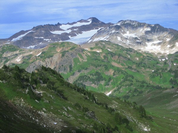 From here, though we didn't know it at the time, we faced another six hours until we would reach our campsite north of Red Pass. Though the trail up to the PCT is only three or four miles, the elevation rises from under 3000 at the River to about 6000 feet. Water was available along the way to help lighten the load, and views of the expanding mountainous horizons encouraged stops along the way. As we trudged higher and higher, fragile-winged butterflies and then an aluminum-winged 737 out on maneuvers flew along with us. (At the avalanche about halfway up, look for the bypass trail to the right.) Five hours later, after briefly missing the left hand turn at the intersection with the PCT (sign missing), we reached Red Pass and, oddly miles from anywhere with seven other hikers who all happened to arrive at the same time, we all gazed across to the partial view of Glacier Peak's rugged south face and down into the White Chuck River valley.