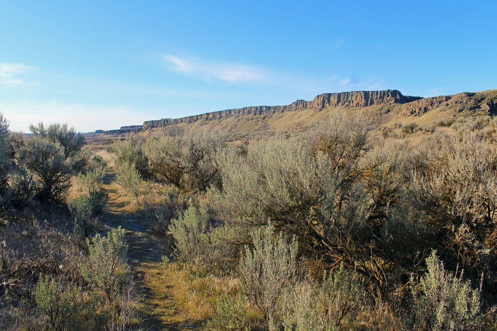 The trail starts at the basalt pillar and an excellent sign board with a detailed map of the trail network. Follow the signs for Crab Creek Trail, heading to the left just past the pillar. The path immediately enters sagebrush and tall grass, home to many of the small birds that can be heard. Early spring is a great season to listen for birds, while rattlesnakes are still out of sight.