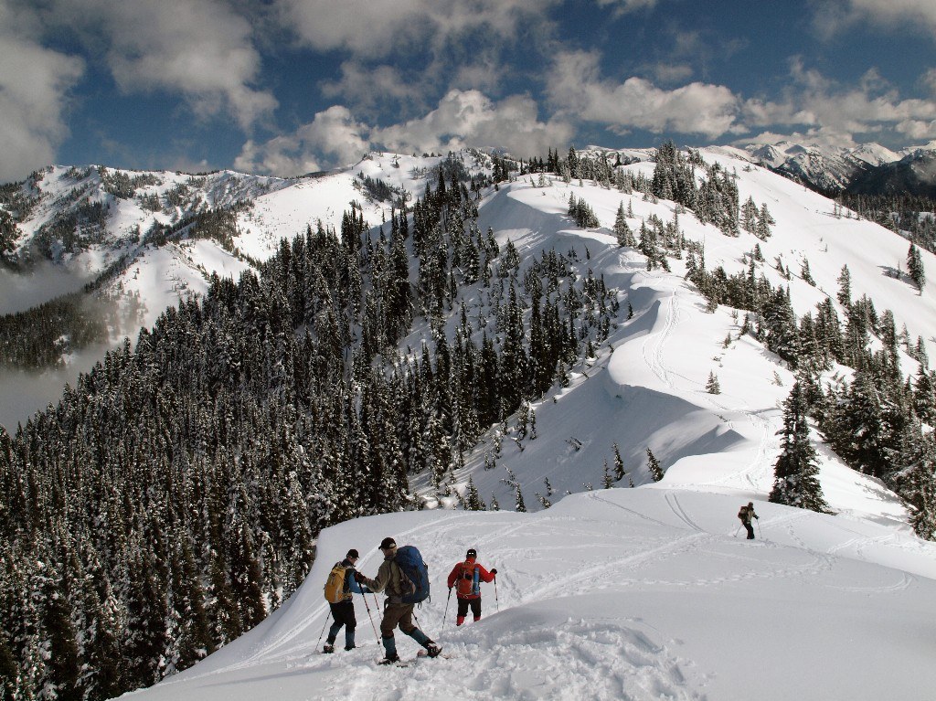 On a beautiful, clear day this is a great snowshoe for scenery and the experience of hiking in some good, dry snow. There is a bit of work involved in that there are a lot of gains and losses in some steep short climbs on the way, both coming and going. The last mile or so back to the trailhead has a steady gain up. There are cornices along the north side of the ridge trail to avoid, but there is room along the ridge to hike and avoid being near them.