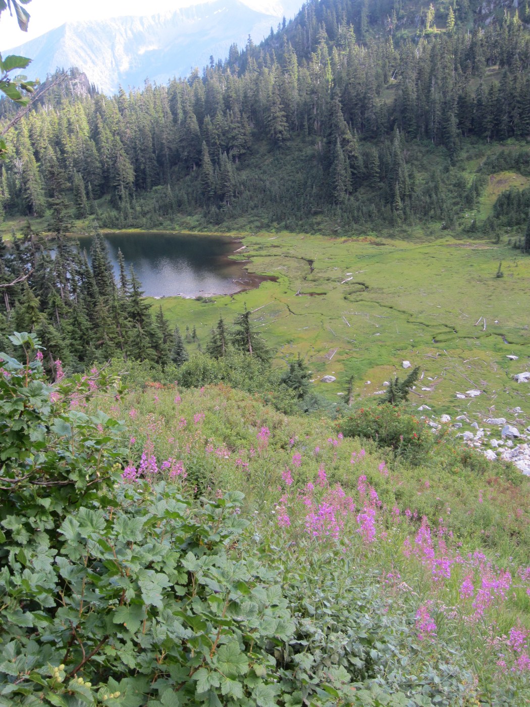 The hike down Howards' south face was very slow, mostly due to the fantastic number of sweet blueberries, but partly because of the bushwacking and routefinding through some rock bands. Crescent Lake is surrounded be fields of flowers and blueberries. There we picked up the Nason Ridge trail back to the trailhead. This return trail also was slow, due to blueberries, boletus edulis, and 800' of elevation gain. By the time we reached the place we had turned off for Mastiff we were getting tired, and the last 3 miles of downhill switchbacks seemed MUCH longer than they had on the way up.