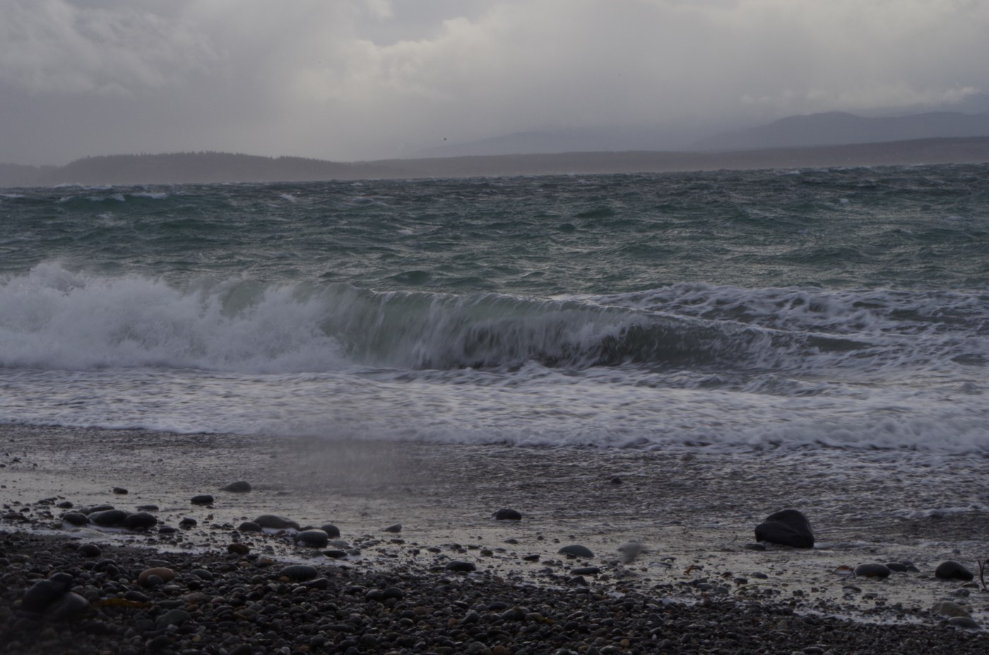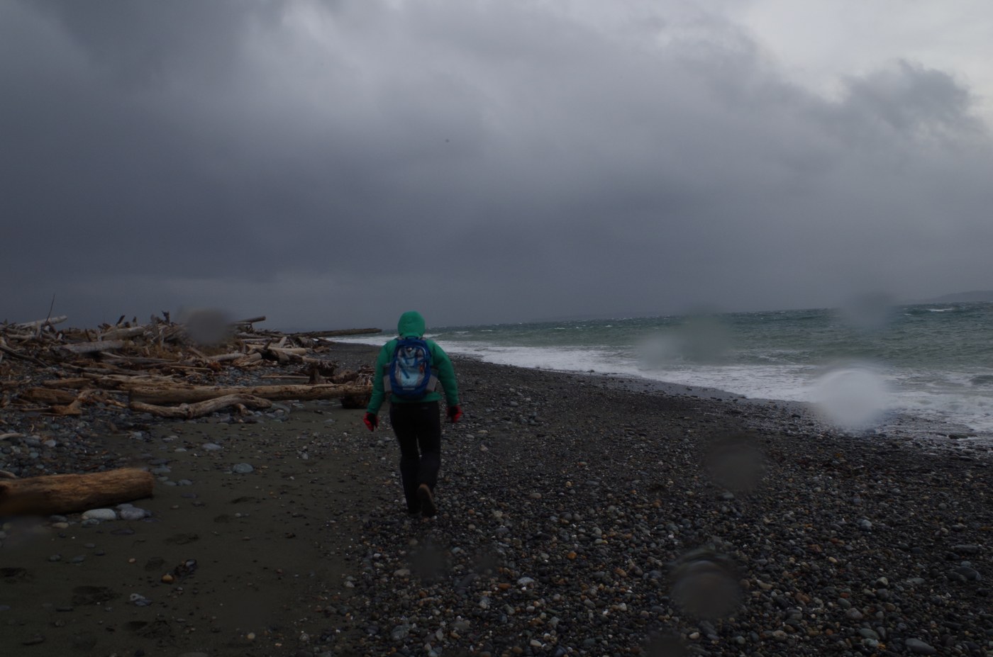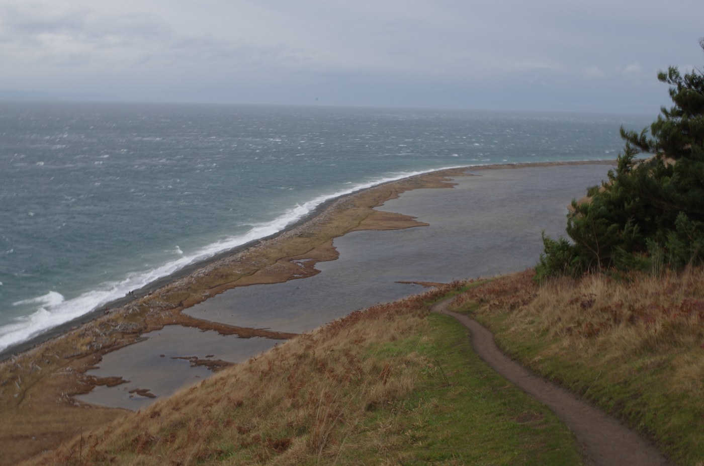 We took the trail to the right and headed along the top of the bluff; again, fantastic views, interesting foliage (the trees were really cool), and lots and lots and lots of wind. Though it might look precarious, the trail itself never makes you feel like you are going to fall over. The descent down to the beach was a little hairy, as the trail was kind of wet and the sand was giving way. Once on the beach, we walked partly along the water, but were much more sheltered when we took the trail along the lagoon. This might be hard to find unless you're willing to climb up and over the large driftwood pile. Walking on the beach itself is a little bit slow because of the mixture of sand and rocks, and the waves were a little to close for comfort in the wind and rain.