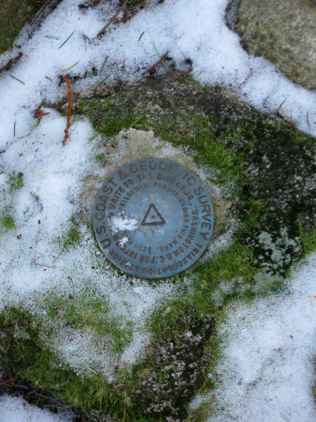 I continued on the Traverse until reaching the familiar large stump with faintly carved facial features that marks the start of the unsigned but venerable trail to the south summit of South Tiger Mountain. The thin coating of snow showed a single set of recent boot prints, from earlier today or yesterday, heading up and back down. I headed up and found a couple of new blowdowns that were easily stepped over, and I was on the "summit" in a few minutes. The south summit is graced with an official USGS Bench Mark, although the north summit may be a few feet higher.