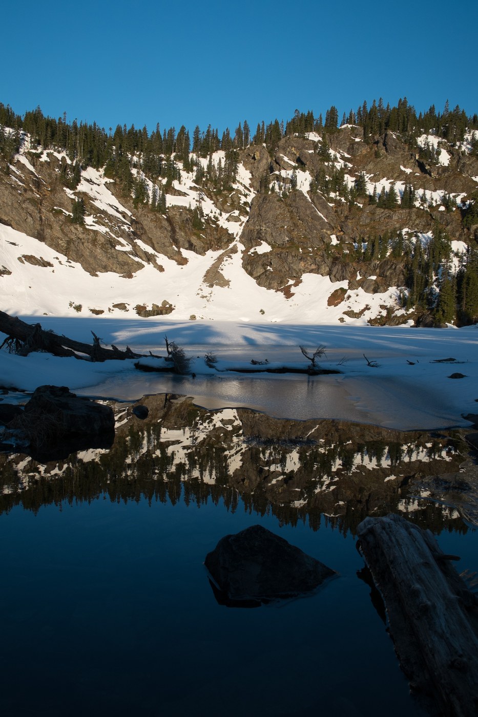 That being said...The woods are old and lovely, especially with beautiful dappled sunlight streaming through and highlighting all of the moss and undergrowth...the water, which accompanies you almost the entire length of the trail in one form or another, is crystal clear and running strong...the peek-a-boo glimpses of vistas along the way are more than enough to spur you on...and Rachel Lake is nestled within a stunning bowl of craggy rock that is right now covered with untouched billowy snow and surrounded by breathtaking views of the hills and peaks and spires that make up this part of the Alpine Lakes Wilderness. This is a place well worth returning to when the snow has lost some of its' icy grip and route-finding becomes less of a necessity.