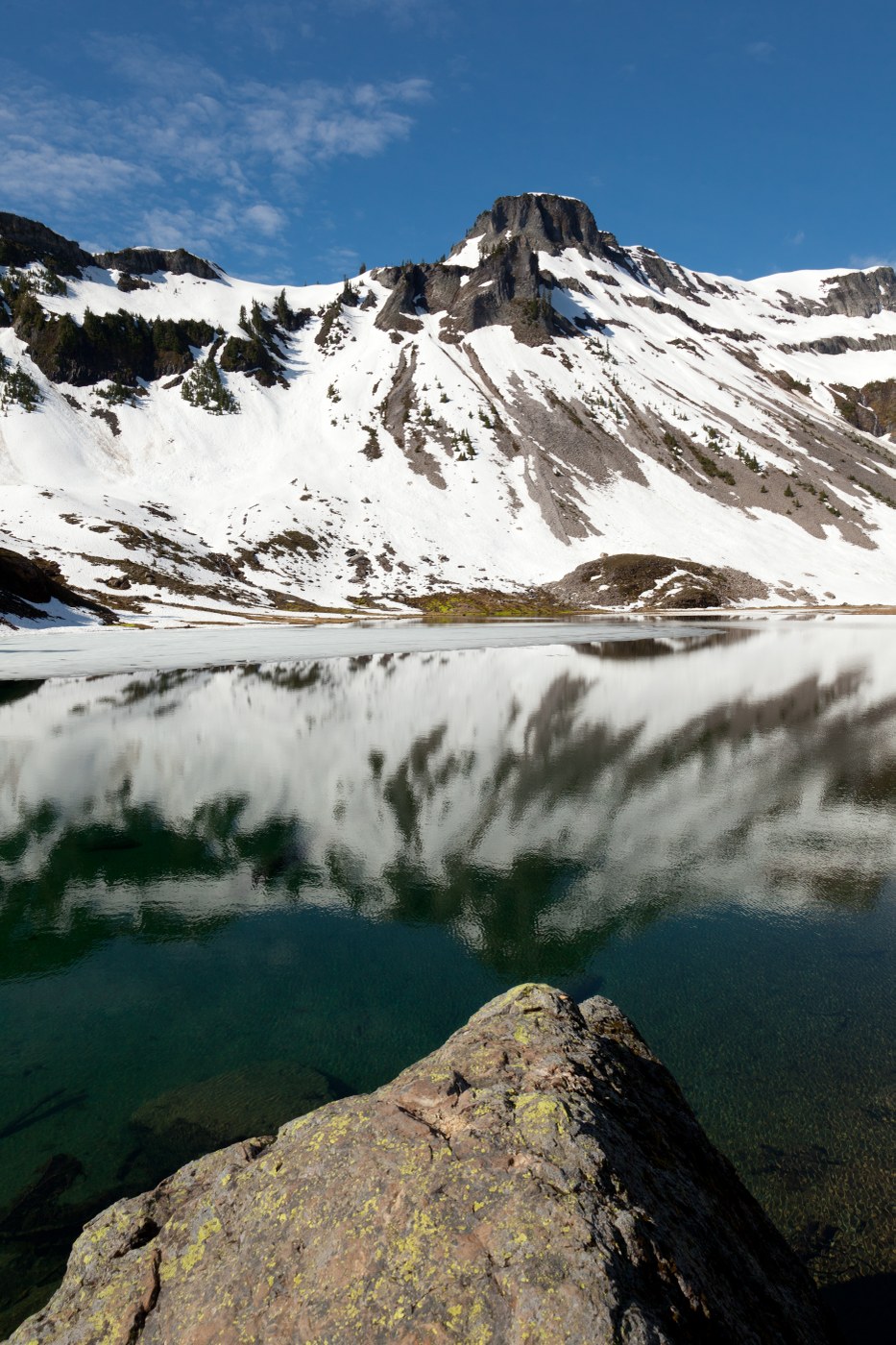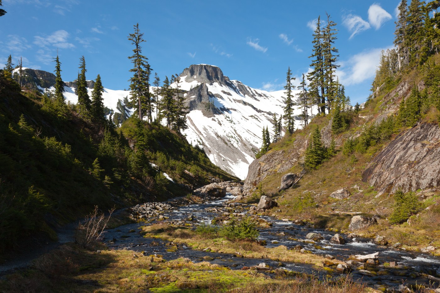 I had tried to hike this trail a few days earlier but a high altitude lightning storm forced me to turn back. I went back a few days later with my wife and the weather was gorgeous. Everywhere you looked there were waterfalls and the sight of much snow on the nearby mountains was really neat. We parked at the Heather Meadows overflow parking where the trailhead starts. There's a few trails here and most intersect each other so you can do a combination of hikes, which is what we did. We started out on the Bagley Lakes Trail and took the Chain Lakes Trail up to Herman Saddle where the trail was covered in snow and became difficult to continue (Note: Bagley Lakes Trail was snowfree). We stopped about halfway up to the ridge and turned around and came back down and had a picnic lunch on a large rock overlooking Mount Shuksan and Bagley Lake. I bouldered around a bit and crossed a stream to a large snow covered hill and tried to slide down on my butt but the snow was too wet. Then I had to boulder back up to get my backpack. Another hair brained idea. My wife was laughing so hard. We took the Chain Lakes trail back and decided to take the Wild Goose Trail back to the parking lot. Wild Goose Trail has an easy initial climb to the visitor center which was closed for the winter still and then proceeded through pine forest where we saw a woodpecker. We plan to go back in the fall and hike this again and complete Chain Lakes Trail.