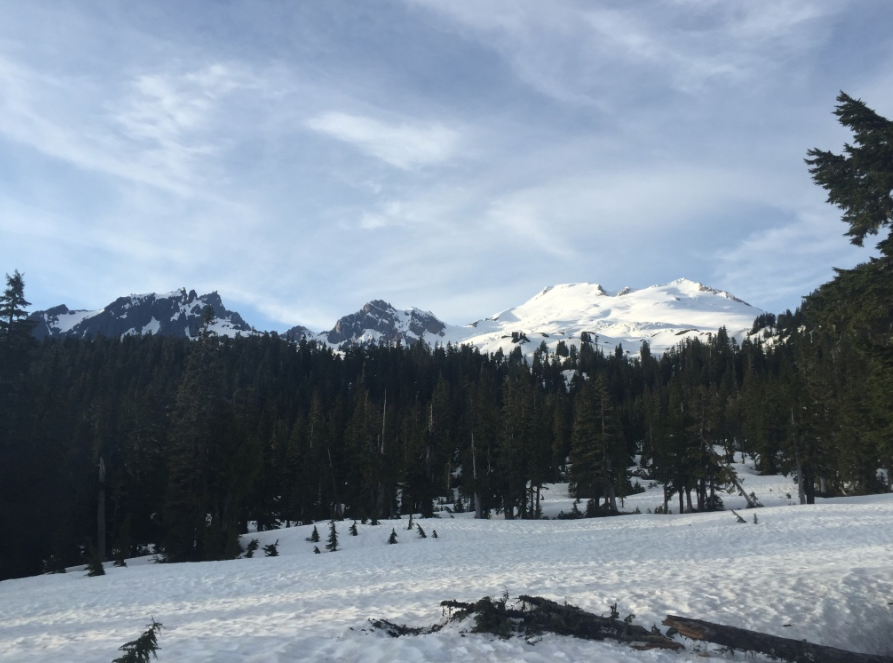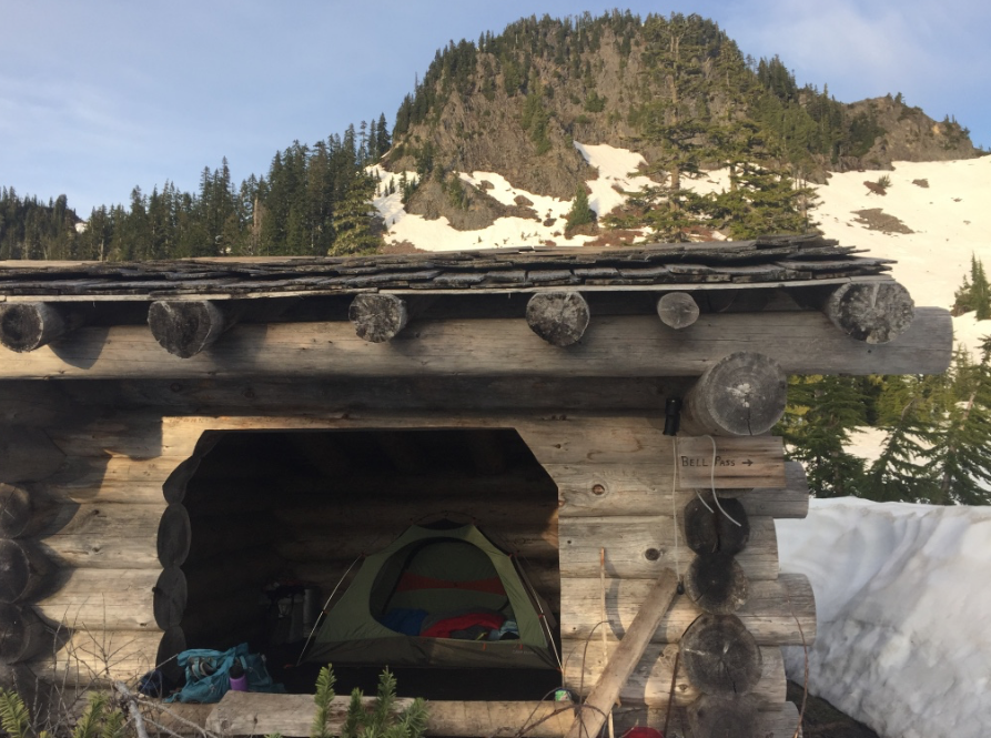 We were lucky enough to encounter gorgeous, sunny weather once we reached the top! The meadow is completely snow covered but thankfully there is a small wooden shelter that is melted out and perfect for setting a tent up in! The meadow boasts gorgeous views of Baker, Park Butte, the Black Buttes, and the Twin Sisters. Park Butte lookout tower is also in view and wouldn't take very long to hike to from the meadow, but we bypassed that for the day due to all the snow. If you brought snowshoes or skis/skins you could enjoy a lovely day of touring around the area. It started raining heavily on us overnight, which made us appreciate the dry shelter even more.