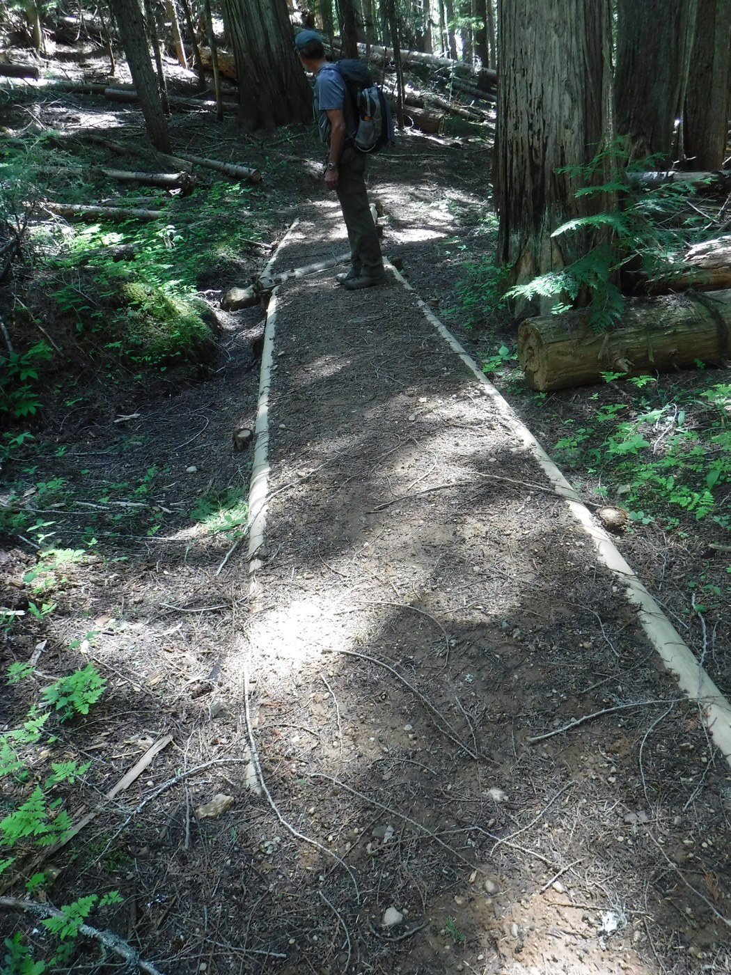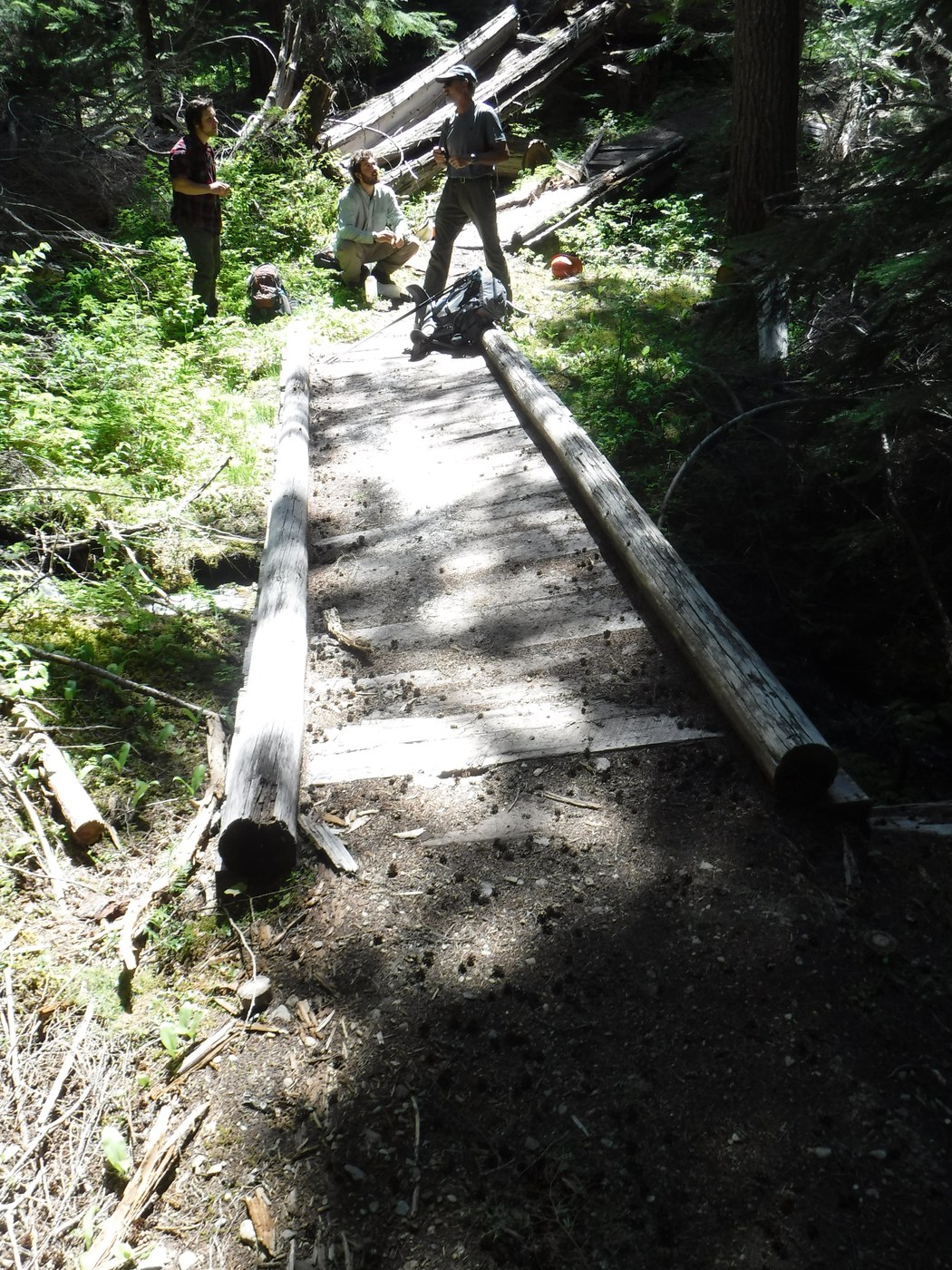 For this trip, we picked one of the free dispersed sites within easy walking distance of our chosen starting location, the Thunder Creek trail. This trail begins on an old roadbed in an old clearcut, but enters the forest in approximately 2 miles. There are several failed & failing puncheon bridges within the first mile of the forested section, at least one of which will likely be a WTA work site later this summer. My main goal for this hike was to check out the location and get information about what will need to be done here. But once that was accomplished, it seemed like a lot more fun to hike the rest of the loop rather than do an out-and-back!