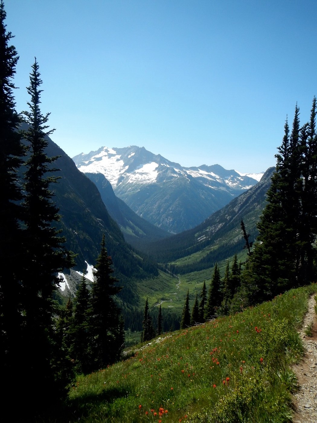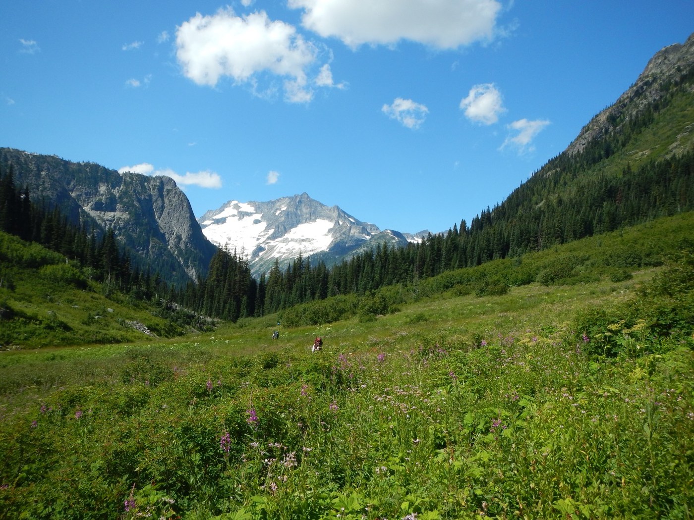 This hike was a multi-day Backcountry Response Team (BCRT) work party in North Cascades National Park. We thru-hiked from the Easy Pass trailhead on Hwy 20 to the Thunder Creek trailhead at Colonial Creek Campground. We overnighted at Fisher, Cosho and Junction Camps with most of the trail work including heavy brushing and log outs occurring between Fisher and Cosho. Easy Pass is a tough climb but the views from the top were spectacular. Fisher Basin is an incredibly scenic and remote location in the North Cascades. Once past the day hikers at Easy Pass, we encountered only one other hiker over the next two days between Fisher and Junction Camps. Wildflowers were past their peak, but still abundant as were the flies and mosquitoes unfortunately. The views from the ridge at Junction Camp are also outstanding- high peaks, several glaciers and waterfalls tumbling into the Thunder Creek drainage. A nice group of trip leaders and volunteers made this a great experience, though the combination of elevation gain/loss, hiking mileage and trail work made this a very rigorous outing.
