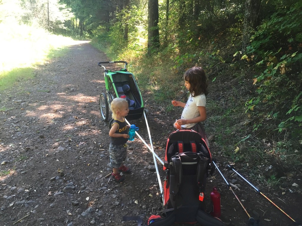 I knew that the double-track approach would be too long for the kids so I rigged up a stroller to pull Lola and put Kai in the backpack. I thought about using our mountain bike, but figured this would be easier on me.