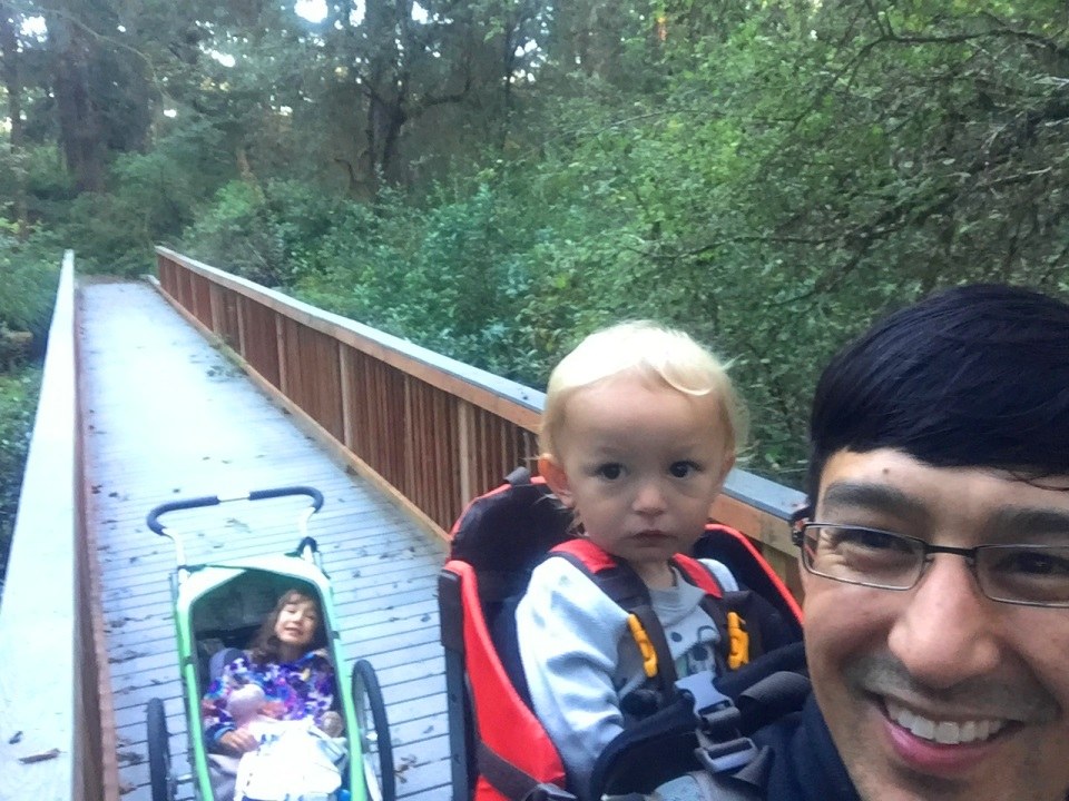 I used our stroller/backpack combo to ferry the kids down the road. Along the way we saw lots of fresh bear scat and soon encountered a mother black bear and her cub! They watched us from far down the road, then ran off into the wetland.