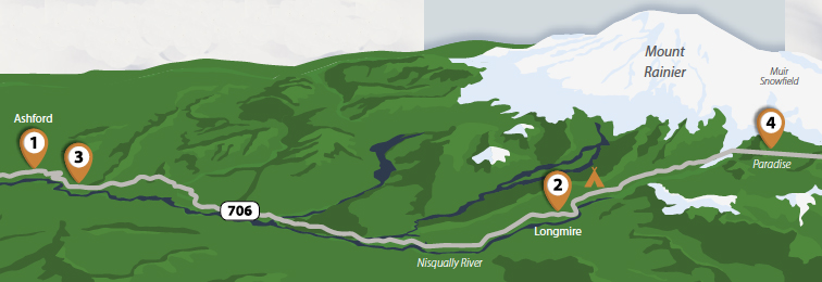 Your weekend begins by driving to Ashford. From the Seattle–Tacoma area, that means taking State Route 7 south; from the Portland–Vancouver area, take U. S. Highway 12 east to SR 7 north. If you’re coming from the east side of the Cascades, the Yakima and Spokane areas, you have a bit more of a trek. When White Pass on US 12 is open, that is the quickest route to connect to SR 7 north; if the pass is closed, then opt for Interstate 90 west over Snoqualmie Pass and work your way south to connect to SR 7 south.