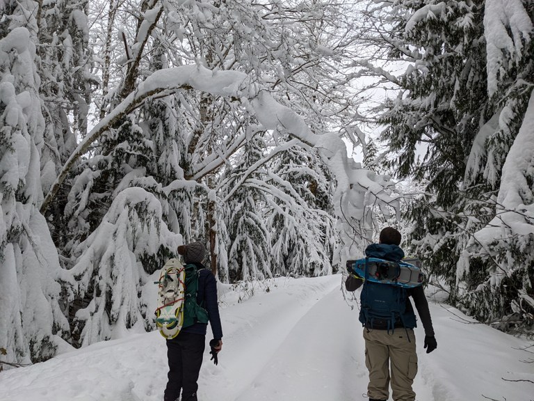 We learned from a year round resident that it happened to be the last day that forest road 9070 would be groomed for cross country skiing, and took advantage of the easy terrain to snowshoe the 4.5 miles to the Mt Catherine trail head — MITllama, April, Mount Catherine'
