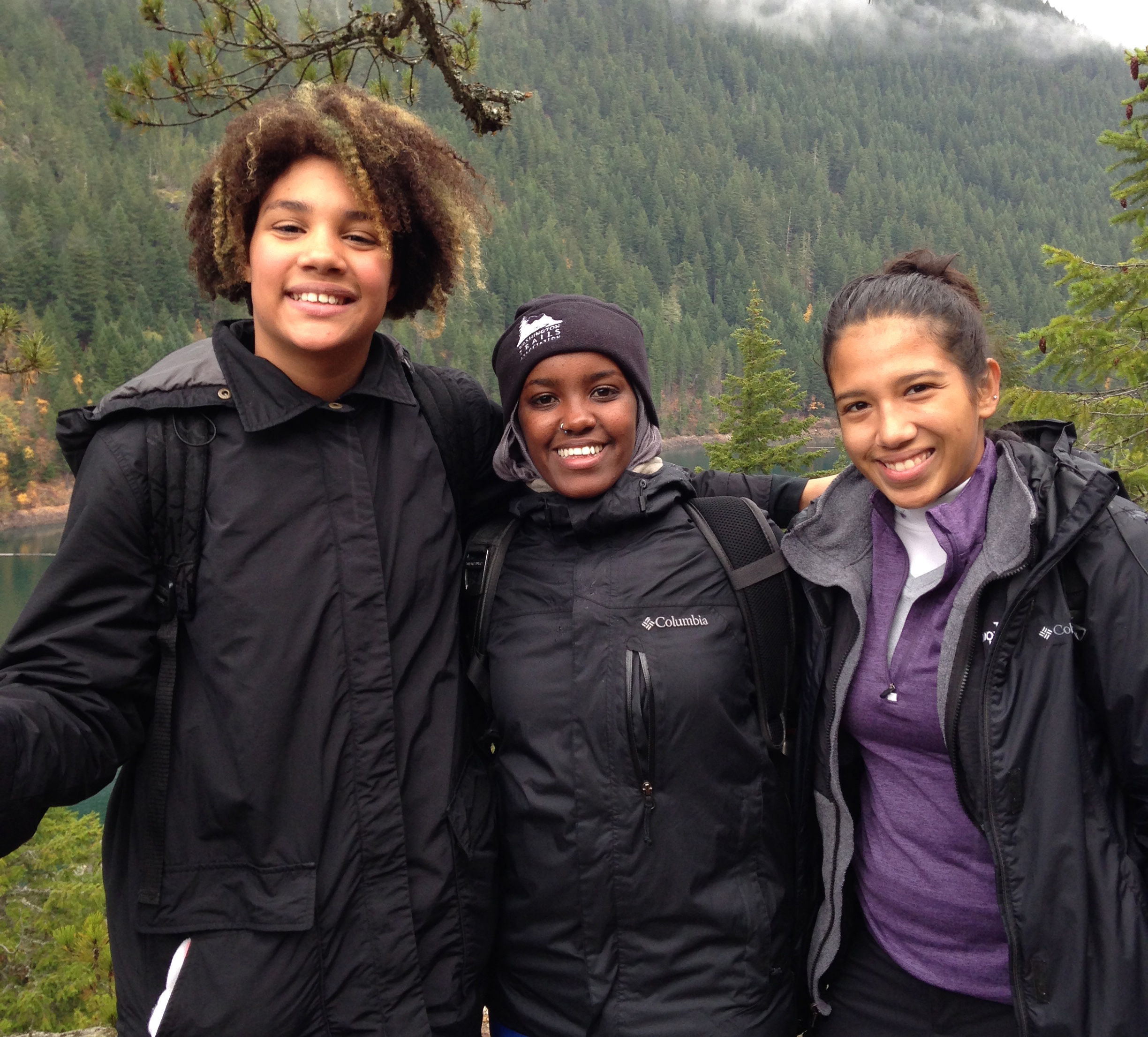 - Francesca Hill, Halimo Maie and Danielle Benavides borrowed gear from WTA’s gear library for a trip to the North Cascades with Young Women Empowered. Photo by Adiza Ameh, Y-WE Program Coordinator.