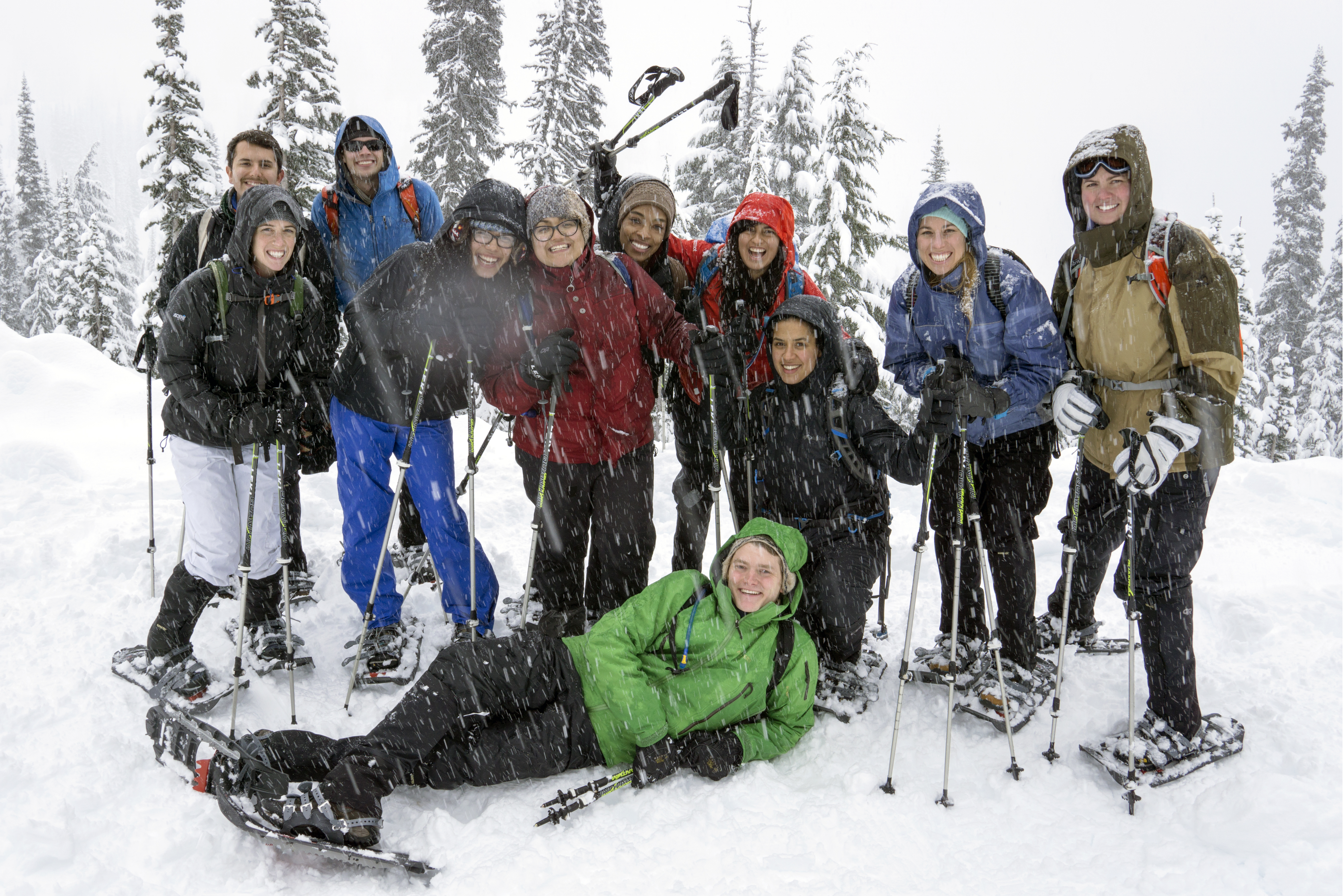 - WTA's Chandrika Francis (kneeling) and participants from the first OLT Snowshoeing Workshop in January. Photo by Andrew Pringle