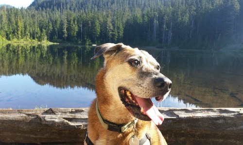 Madigan's a 60-pound mutt who learned to love the outdoors and share trails with people and other pups. Now, his humans are learning how to take an older dog hiking.
